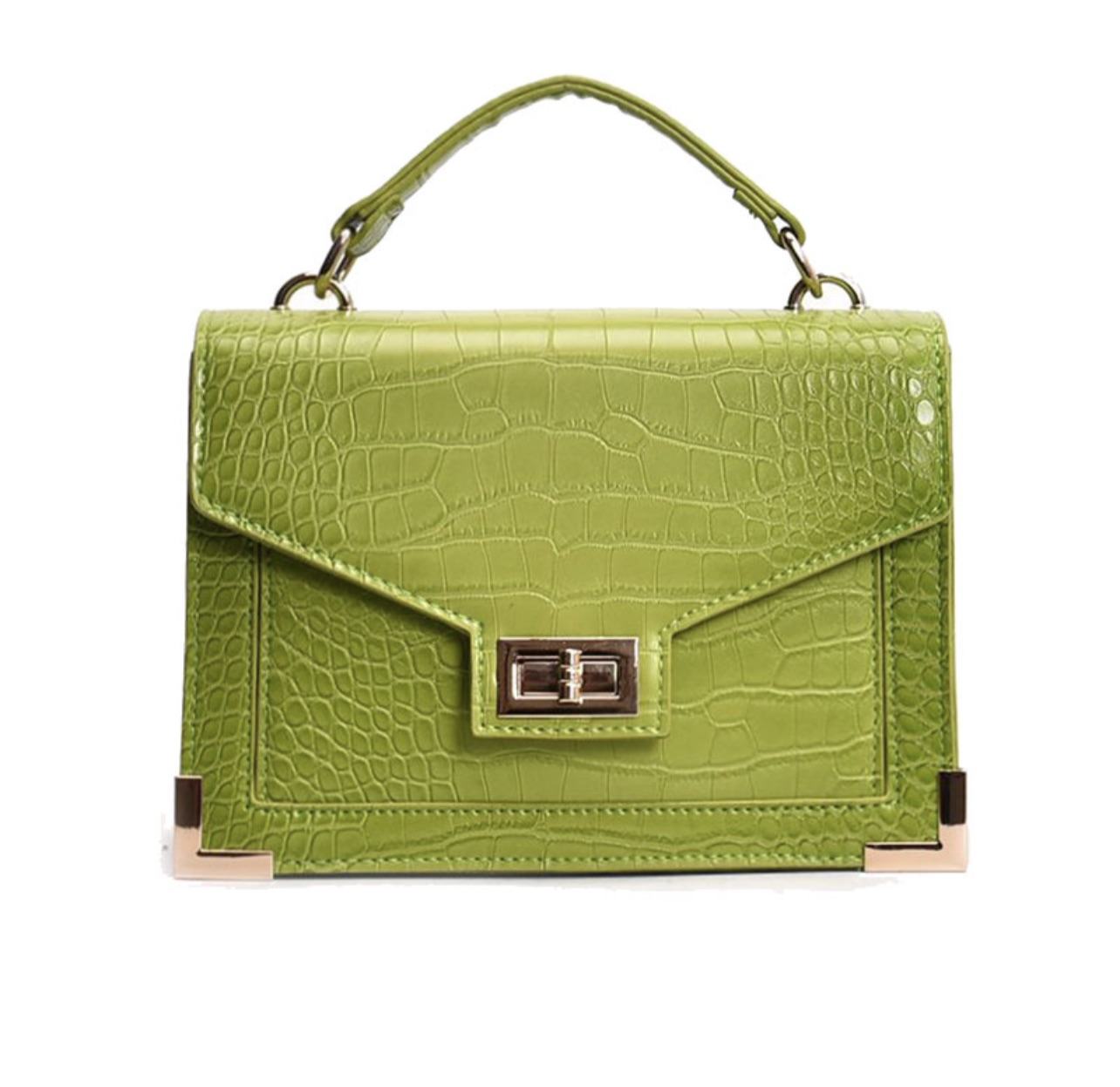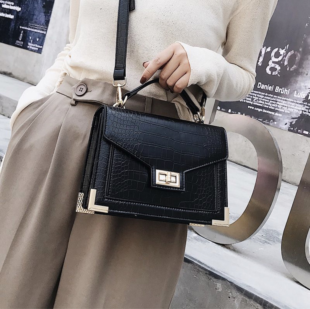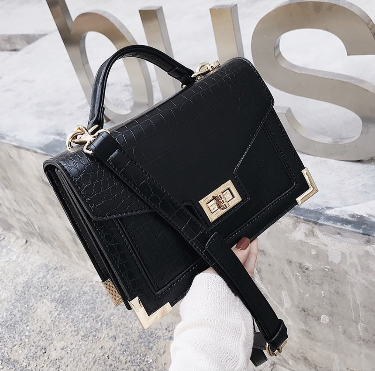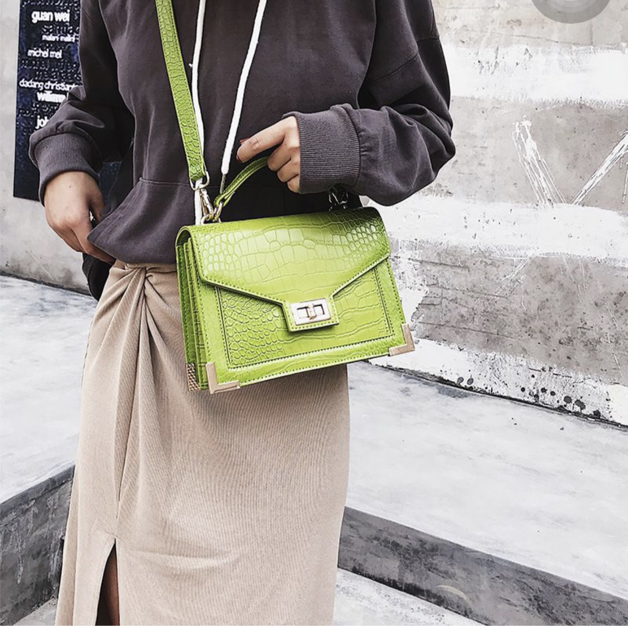 It has a beautiful crocodile pattern all over the bag with Gold outlines at each corner to give this bag a bougie look.